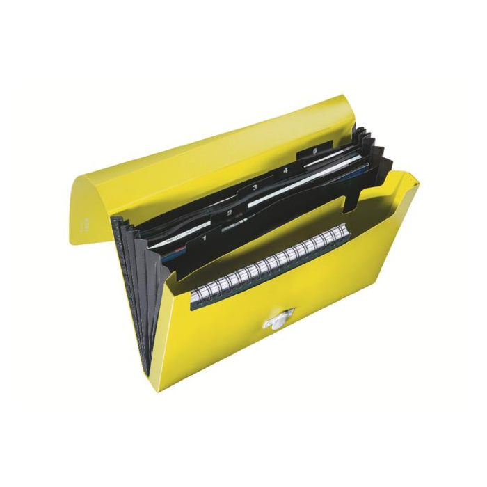 Pútavý dizajn, prvotriedna kvalita, PP, roztváracia aktovka s 5 priehradkami vhodná na každodenné použitie v škole, v kancelárii aj doma. Vyrobené z 80 % z recyklovaného plastu, s neutrálnou uhlíkovou stopou, 100 % recyklovateľné a s ekologickým certifikátom Blue Angel. Farba žltá.