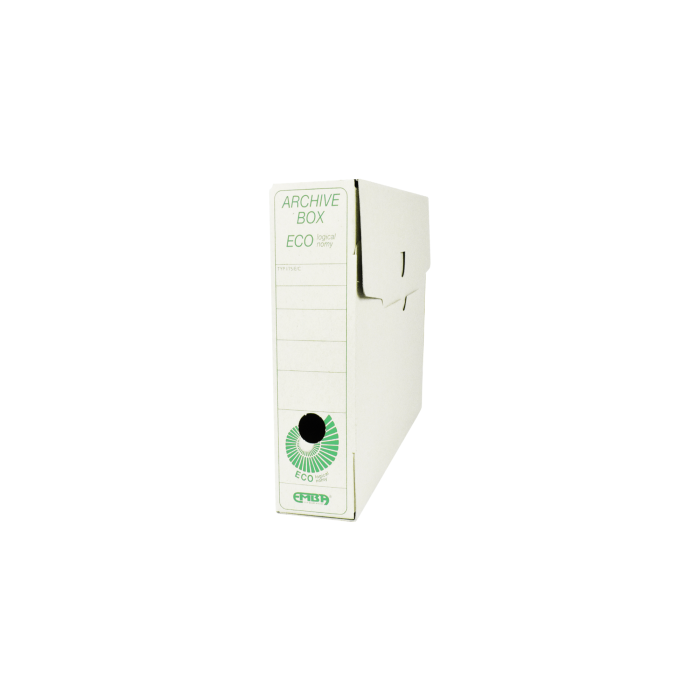 Archívny box ECO A4 sa používa pri rozdelení agendy, účtovných rokov alebo ako firemná farba. Vyrobený z lepenky hrúbky 0,9 mm. Možnosť prehľadného popisu, uloženie v troch polohách. Vhodný v kombinácii so skupinovým boxom - možnosť vložiť 5 boxov I/ 75/ ECO. Ekologicky šetrný výrobok z hladkej ručnej lepenky, 1 000 g/ m². Rozmery 75 × 325 × 240 mm. Dodávaný v rozloženom stave. Väčšie balenie 25 ks.