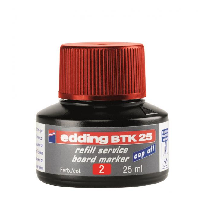 Atrament slabého zápachu s kapilárnym systémom na dopĺňanie popisovačov edding 250, 360, 361 a 363, určených na biele tabule. Tento chemický prípravok je nebezpečný. Obsah fľaštičky 25 ml.Pri doĺňaní vložte prednú časť popisovača špičkou do fľaštičky a po niekoľkých minútach bude popisovač pripravený k opätovnému použitiu.