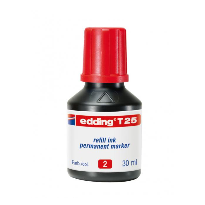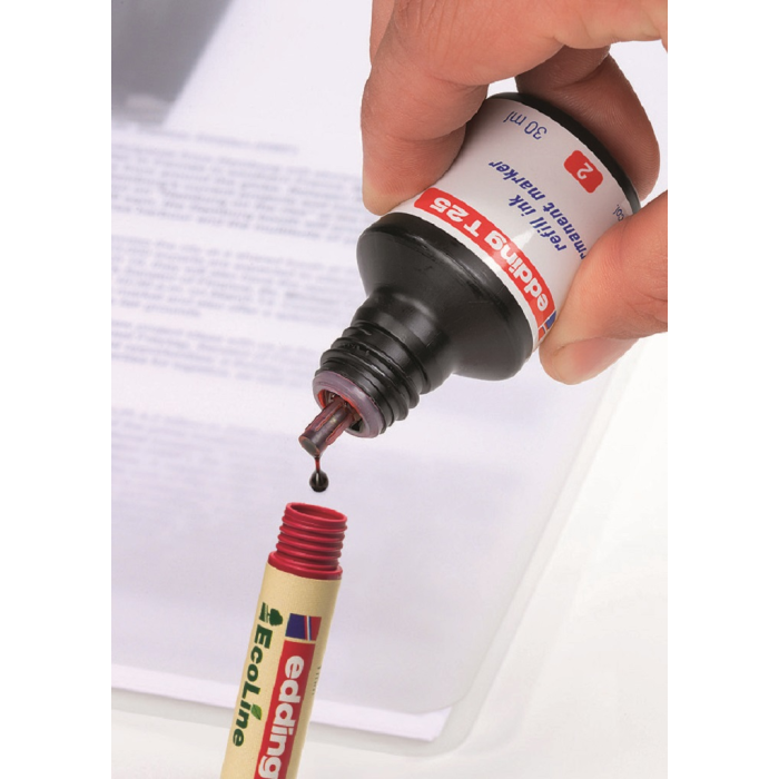 Atrament s kvapkovým dávkovačom na dopĺňanie permanentných popisovačov edding 2000 C, 2200 C, 400, 500, 550, 800, 850, 370 a 390. Pri dopĺňaní vložte prednú časť popisovača špičkou do fľaštičky a po niekoľkých minútach bude popisovač pripravený k opätovnému použitiu. Obsah 30 ml. Tento chemický prípravok je nebezpečný.