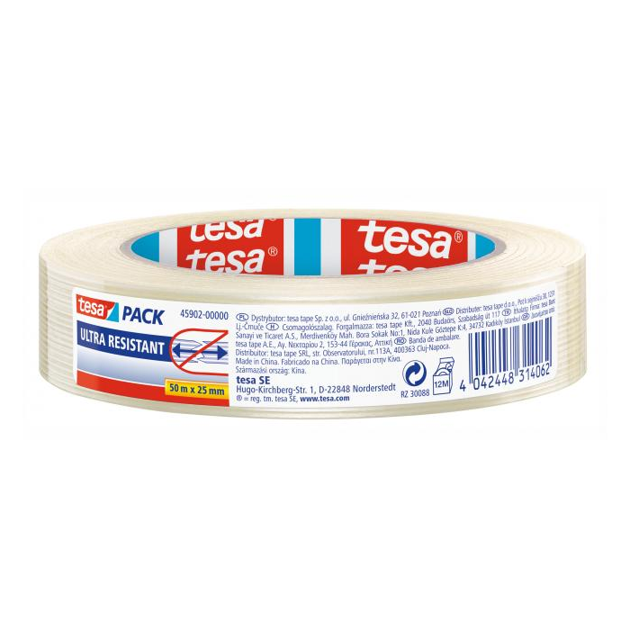 Ultra odolná baliaca páska vystužená vláknami tesapack® so sklolaminátového vlákna / PET je vhodná na krabice s rôznym spôsobom použitia. Veľmi vysoká lepivosť. Farba priehľadná. Rozmery 25 mm × 50 m.