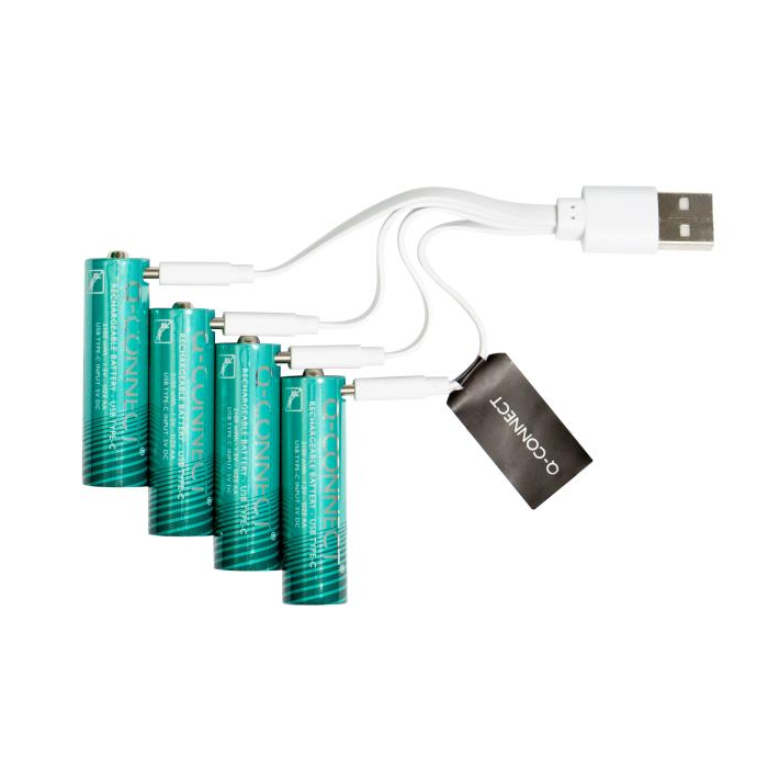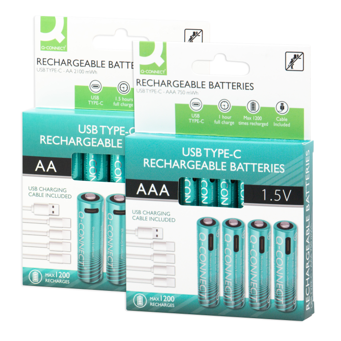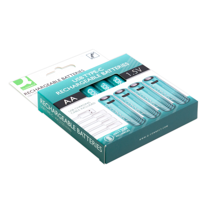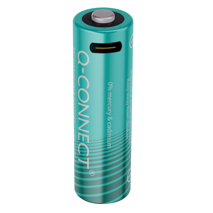 Nabíjteľné AA batérie Q-Connect, ktoré je možné jednoducho nabiť pomocou pripojenia USB-C, rovnako ako napríklad telefón. Doba doba nabíjania je 2-3h. Súčasťou balenia sú 4 ks nabíjateľných batérií a 1 ks kábla.