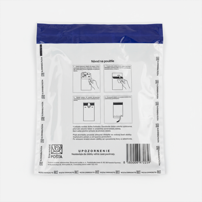Bezpečnostné plastové obálky na prevoz a uchovanie dôverných dokumentov, finančných hotovostí alebo iných hodnôt. Poskytujú vysokú bezpečnosť, nakoľko špeciálna lepiaca páska a ďalšie bezpečnostné riešenia zaručujú, aby obálka nemohla byť otvorená bez viditeľných stôp. Manipulácia s obálkami je veľmi jednoduchá, pohodlná a rýchla.Vonkajší rozmer 255x200mm. Vnútorný rozmer 245x185 mm. Obálka je vyrobena z LDPE Coex folie. Farba čierno-sivá s popisovaciou zonou / žltou /. Ma jednorázovu bezpečnostnú pásku zabraňujúcu neželanému otvoreniu s čiarovým kódom. Potlač `Slovenska pošta`.