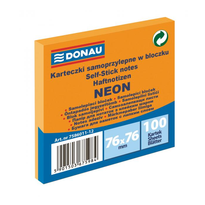 Univerzálne neónové samolepiace bločky z papiera gramáže 70 g / m², 100-lístkové, jednotlivo balené. Lepidlo zmývateľné vodou. Udelený Green Point za účasť na recyklácii a zhodnocovaní odpadov vyplývajúcich z ustanovení nariadení EÚ. Väčšie balenie 12 ks. Farba oranžová.