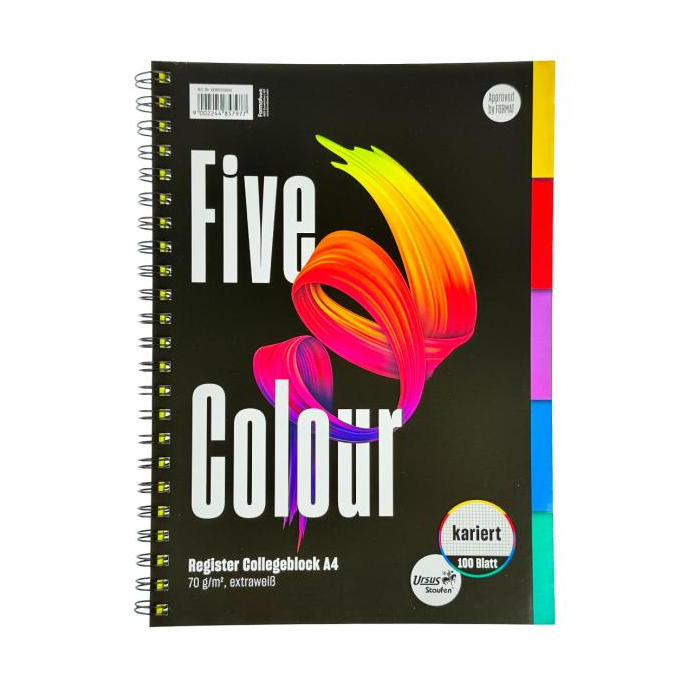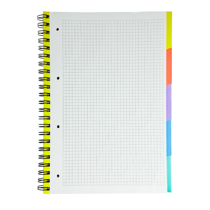 Blok formátu A4 s farebným registrom, mikro perforáciou a kovovou bočnou špirálou, vyrobený z kvalitného bieleho ekologického papiera 70 g / m2. 5-farebná registrácia na pravom okraji bloku. Každá farba registra obsahuje 20 listov papiera. Vonkajšia krycia fólia odpudzuje nečistoty a kvapaliny, pevný kartónový podklad.