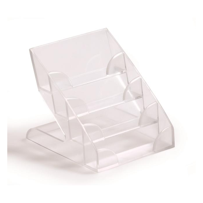 Priehľadný box z plastu so 4 rovnocennými priehradkami na skladovanie vizitiek. Kapacita 240 vizitiek. Možnosť spájania viacerých boxov pomocou spájacieho prvku. Farba číra. Kapacita: 240 vizitiek