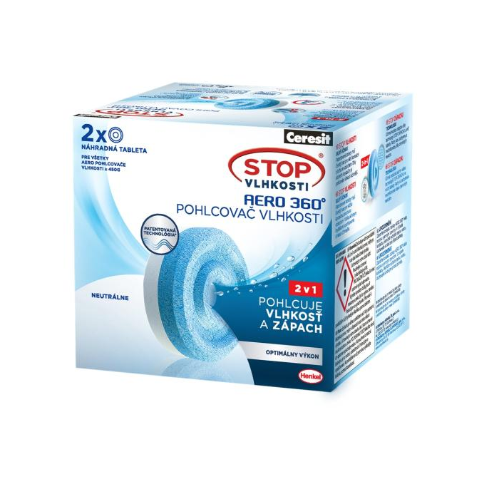Nové tablety boli vyvinuté tak, aby ich účinnok pohlcovania nadmernej vlhkosti bol vyšší až o 40% (po vložení do nového prístroja Ceresit Stop Vlhkosti AERO 360°). Vďaka členitému tvaru a prúdeniu vzduchu okolo tablety sú prvé absorbované kvapky viditeľné už po 12 hodinách. Tablety v prístroji sa spotrebovávajú postupne, zmenšujú svoj objem. Vyzrážaná tekutina sa sústreďuje v spodnej časti prístroja. Po spotrebovaní je potrebné vložiť novú tabletu. Dôležité je vkladať tabletu do nového prístroja AERO 360° po jeho otvorení modrou stranou nadol.