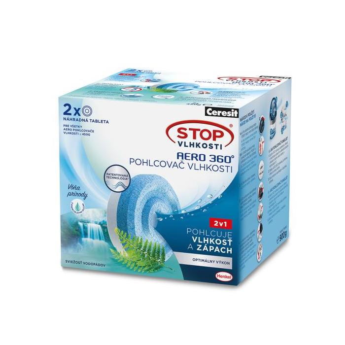 Nové tablety boli vyvinuté tak, aby ich účinnok pohlcovania nadmernej vlhkosti bol vyšší až o 40% (po vložení do nového prístroja Ceresit Stop Vlhkosti AERO 360°). Vďaka členitému tvaru a prúdeniu vzduchu okolo tablety sú prvé absorbované kvapky viditeľné už po 12 hodinách. Tablety v prístroji sa spotrebovávajú postupne, zmenšujú svoj objem. Vyzrážaná tekutina sa sústreďuje v spodnej časti prístroja. Po spotrebovaní je potrebné vložiť novú tabletu. Dôležité je vkladať tabletu do nového prístroja AERO 360° po jeho otvorení modrou stranou nadol.