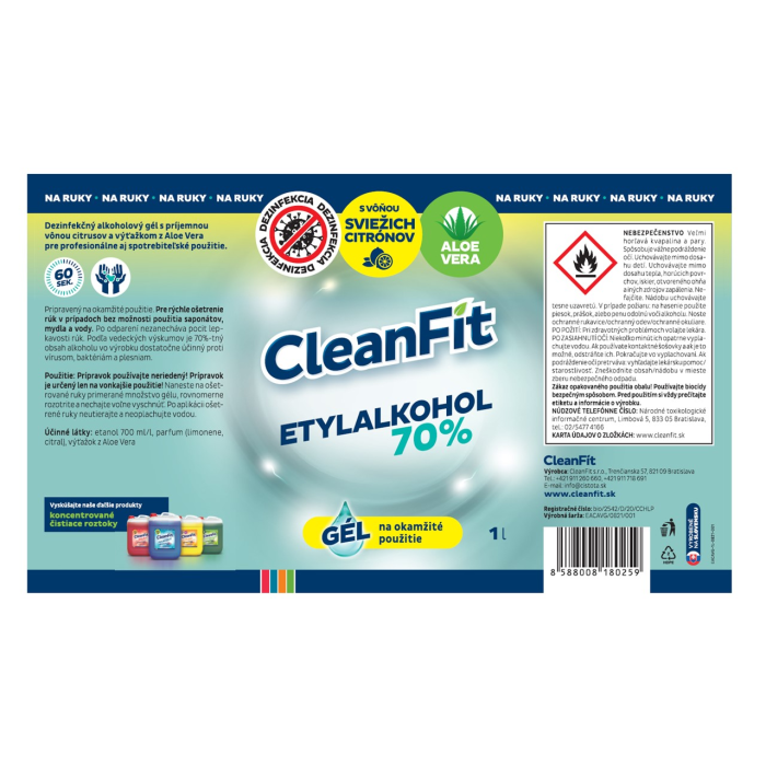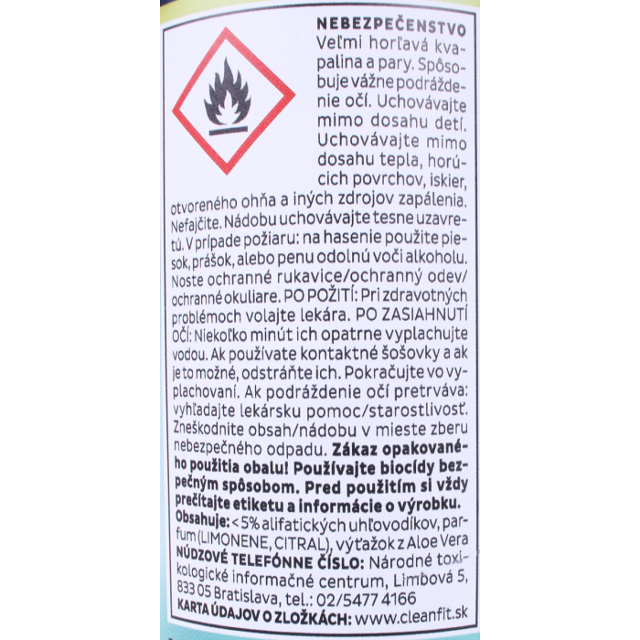 Upozornenie: H225 Veľmi horľavá kvapalina a pary. H319 Spôsobuje vážne podráždenie očí. bezpečnostné upozornenie P102 Uchovávajte mimo dosahu detí. P210 Uchovávajte mimo dosahu tepla, horúcich povrchov, iskier, otvoreného ohňa a iných zdrojov zapálenia. Nefajčite. P233 Nádobu uchovávajte tesne uzavretú. P280 Noste ochranné rukavice/ochranný odev/ochranné okuliare. P301 + P312 PO POŽITÍ: Pri zdravotných problémoch volajte lekára P305+P351+P338 PO ZASIAHNUTÍ OČÍ: Niekoľko minút ich opatrne vyplachujte vodou.