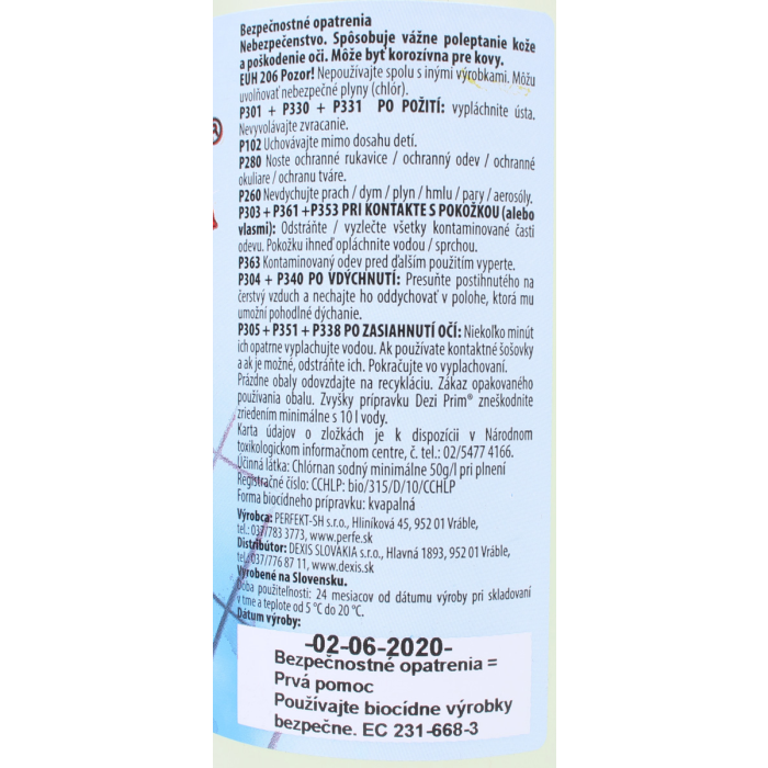 EUH 206 Pozor! Nepoužívajte spolu s inými výrobkami. Môžu uvolnovať nebezpečné plyny ( chlór).