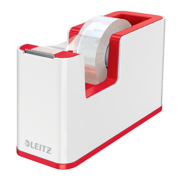 Atraktívny dispenzor s lepiacou páskou v dvojfarebnom prevedení v metalických farbách Leitz WOW s lesklým povrchom. V praktickom dizajne na pohodlné ovládanie jednou rukou. Farba biela/červená.