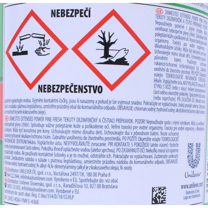 POZOR! Nepoužívajte spolu s inými výrobkami. Môžu sa uvoľňovať nebezpečné plyny (chlór). Spôsobuje vážne poleptanie kože a poškodenie očí. Veľmi toxický pre vodné organizmy. Môže byť korozívna pre kovy. Uchovávajte mimo dosahu detí. Uchovávajte iba v pôvodnej nádobe. Zabráňte uvoľneniu do životného prostredia. Noste ochranné rukavice/ochranný odev/ochranné okuliare/ochranu tváre. PRI KONTAKTE S POKOŽKOU (alebo vlasmi): Všetky kontaminované časti odevu okamžite vyzlečte. Pokožku opláchnite vodou/sprchou. PO ZASIAHNUTÍ OČÍ: Niekoľko minút ich opatrne vyplachujte vodou. Ak používate kontaktné šošovky a ak je to možné, odstráňte ich. Pokračujte vo vyplachovaní. Okamžite volajte TOXIKOLOGICKÉ INFORMAČNÉ CENTRUM/lekára. Zozbierajte uniknutý produkt. OBSAHUJE: chlórnan sodný; hydroxid sodný; N-alkyl-N,N-dimetylamíny (alkyl je z kokosového oleja), N-oxidy.