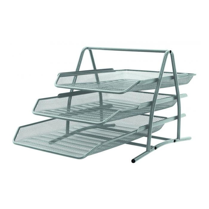 Stojan s 3 odkladačmi na dokumenty do formátu A4+ v drôtenej úprave. Stohovanie kolmo nad sebou. Rozmery 350 × 275 × 278 mm.