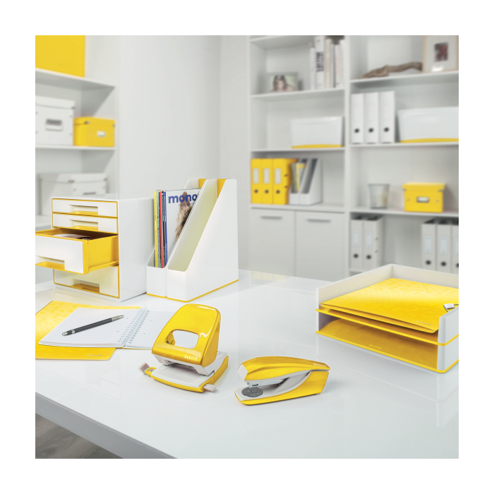 Elektrická zošívačka Leitz New NeXXt WOW. Vďaka jednoduchému ovládaniu jednou rukou je ideálna na časté používanie. Technológia s napájaním na batérie na zošívanie v pohybe. V žiarivých farbách WOW. Batérie (4× 1,5 V AAA LR03) nie sú súčasťou balenia. Kapacita 10 listov. Náhradné spinky ES556800. Farba žltá.