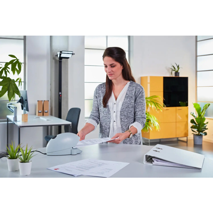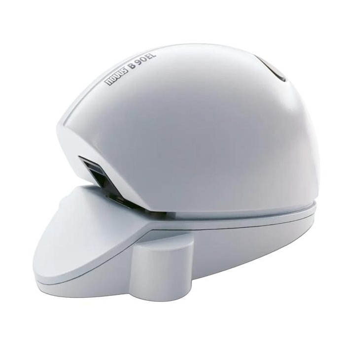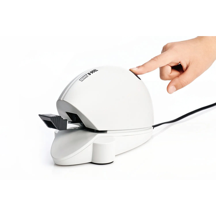 Elektrická zošívačka v modernom dizajne pre použitie v kanceláriach. Zásobník spiniek s plastovým osadením a dvojitým vedením. Kapacita náplne 210 spiniek ozn. NE 6. Hĺbka zošívania 1 cm. Hmotnosť 650 g. Napájanie z elektrickej siete 230 V/ 50 Hz. Farba: sivá Kapacita listov: 20 Hĺbka zošívania: 1 cm