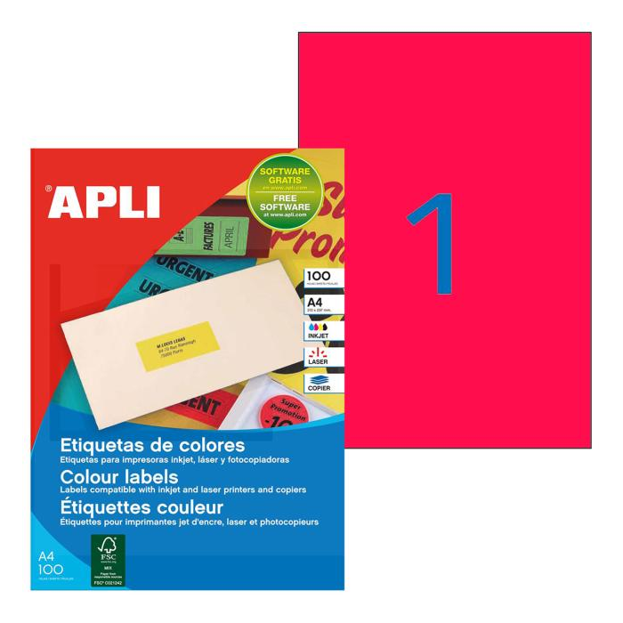 Etikety farebné 210x297mm APLI A4 100 hárkov fluo červené