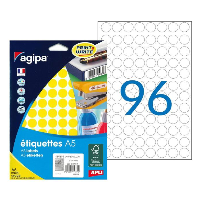 Etikety kruhové 15mm Agipa A5 žlté