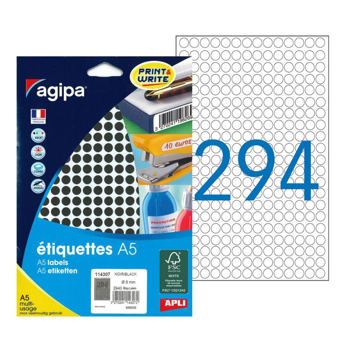 Farebné kruhové etikety na formáte A5. Farba čierna. Počet etikiet v baleni 2940 ks.