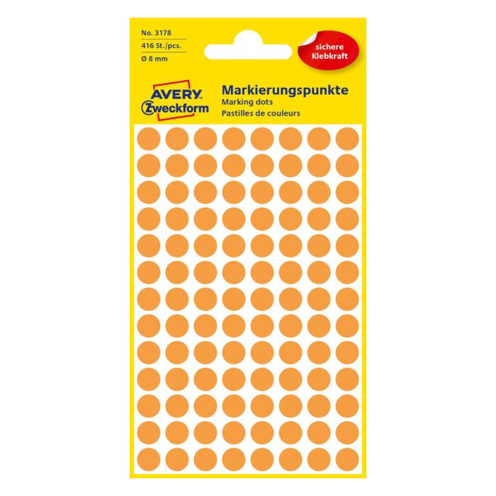 Kruhové etikety na ručný popis. Priemer 8 mm. Farba neónová oranžová. Etikety v balení : 416 kusov.