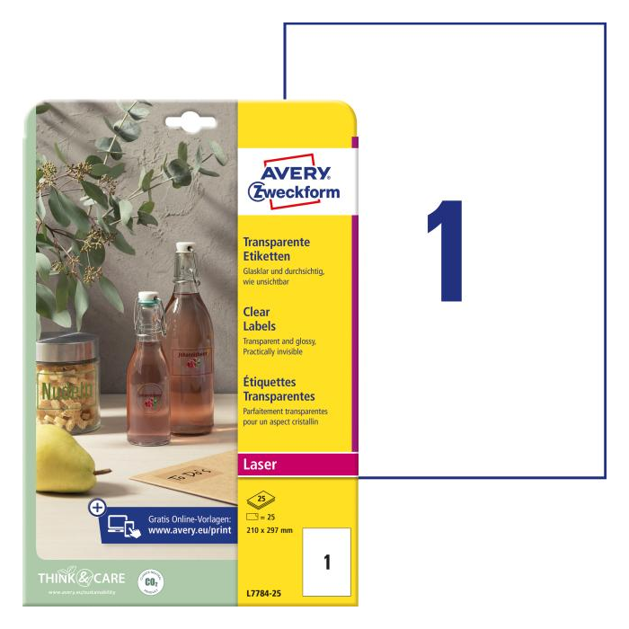 Veľmi odolné polyesterové etikety odolné voči oleju, prachu, špine, natrhnutiu, vode. Kryštalicky číre etikety sú odolné voči teplotám od −20 °C do +80 °C, Etikety sú určené pre tlač v laserových a farebných laserových tlačiarňach. Kryštalicky číre etikety sú po nalepení takmer neviditeľné, hlavne na lesklých povrchoch. Sú vhodné pre použitie na sklo, plasty, kov a lesklé povrchy. Pre vonkajšie použitie. Rozmer 210 x 297 mm. Balenie 25 hárkov.
