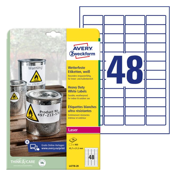 Rozmery v mm : 45,7 × 21,2. Farba biela. Etikety na hárku 48 kusov. Balenie 20 hárkov.