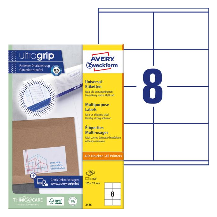 Biele univerzálne etikety vhodné na každodenné použitie v atramentových a laserových tlačiarňach a kopírovacích strojoch. Vďaka inovatívnej technológie ultragrip sa môžete spoľahnúť na bezchybné natiahnutie archu a tlač bez zasekávania. Bezpečnostný okraj QCT zabraňuje zanášaniu tlačiarne lepidlom. Pre laserové tlačiarne testované a certifi kované TÜV SÜD. Vysoká lepivosť na rôznych povrchoch. Ostrá tlač bez bez rozmazávania. Etikety sú vyrobené spôsobom šetrným k životnému prostrediu, majú certifi káciu FSC®, sú bielené bez použitia chlóru. Šablóny a softvér pre jednoduchú a rýchlu tlač etikiet k dispozícii zdarma. U niektorých rozmerov systém QuickPEEL™ na rýchlejšie odlepenie etikiet. Formát A4. Balenie 100 hárkov. Farba biela.
