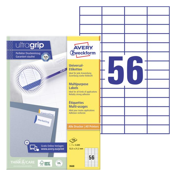 Biele univerzálne etikety vhodné na každodenné použitie v atramentových a laserových tlačiarňach a kopírovacích strojoch. Vďaka inovatívnej technológie ultragrip sa môžete spoľahnúť na bezchybné natiahnutie archu a tlač bez zasekávania. Bezpečnostný okraj QCT zabraňuje zanášaniu tlačiarne lepidlom. Pre laserové tlačiarne testované a certifi kované TÜV SÜD. Vysoká lepivosť na rôznych povrchoch. Ostrá tlač bez bez rozmazávania. Etikety sú vyrobené spôsobom šetrným k životnému prostrediu, majú certifi káciu FSC®, sú bielené bez použitia chlóru. Šablóny a softvér pre jednoduchú a rýchlu tlač etikiet k dispozícii zdarma. U niektorých rozmerov systém QuickPEEL™ na rýchlejšie odlepenie etikiet. Formát A4. Balenie 100 hárkov. Farba biela.