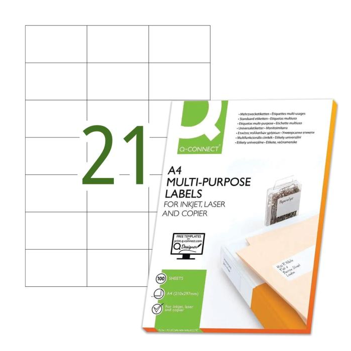 Univerzálne samolepiace etikety pre laserové a atramentové tlačiarne a kopírovacie zariadenia. Formát A4. Farba biela. Balenie 100 hárkov. Etikety na hárku 21 ks.