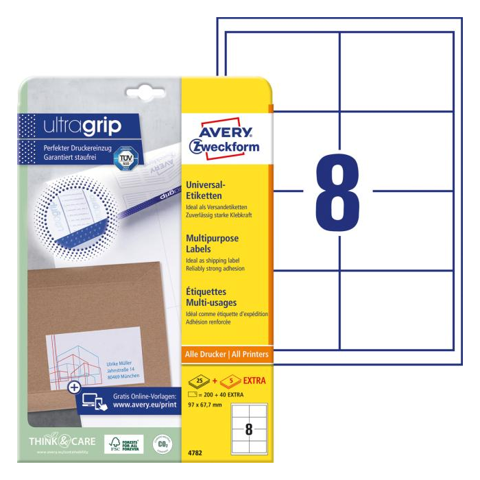 Biele univerzálne etikety vhodné na každodenné použitie v atramentových a laserových tlačiarňach a kopírovacích strojoch. Vďaka inovatívnej technológie ultragrip sa môžete spoľahnúť na bezchybné natiahnutie archu a tlač bez zasekávania. Bezpečnostný okraj QCT zabraňuje zanášaniu tlačiarne lepidlom. Pre laserové tlačiarne testované