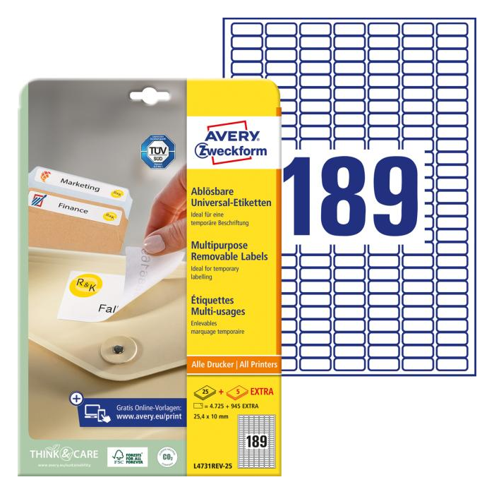 Odnímateľné samolepiace etikety odlepiteľné a znovu prelepiteľné (na bežnom povrchu až 5×) bez toho, aby zanechali stopy lepidla. Sú vhodné pre všetky druhy tlačiarní a kopíriek. Využiteľné najmä na každodenné pracovné činnosti, ako napr. vytváranie popisov, cenoviek, označovanie výrobkov, majetku a pod. Rozmery v mm : 25,4 × 10. Farba biela. Etikety na hárku 189 ks. Balenie 25+5 hárkov.
