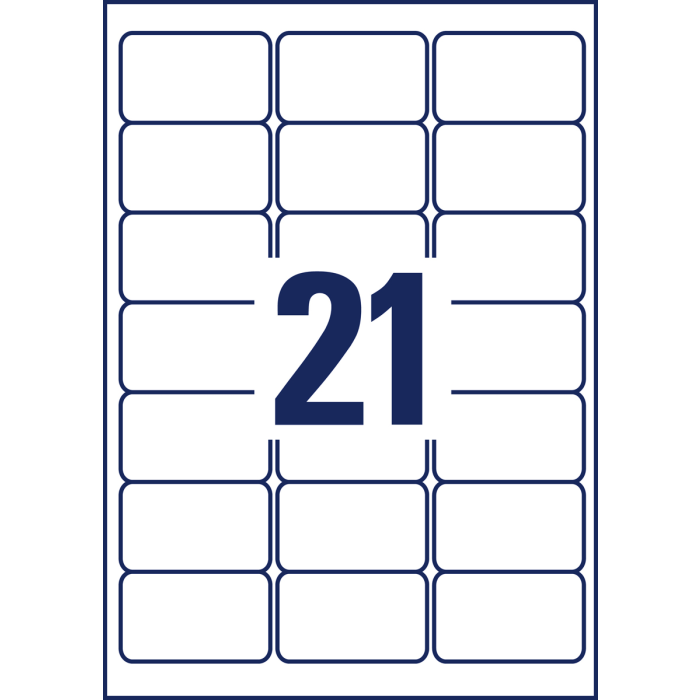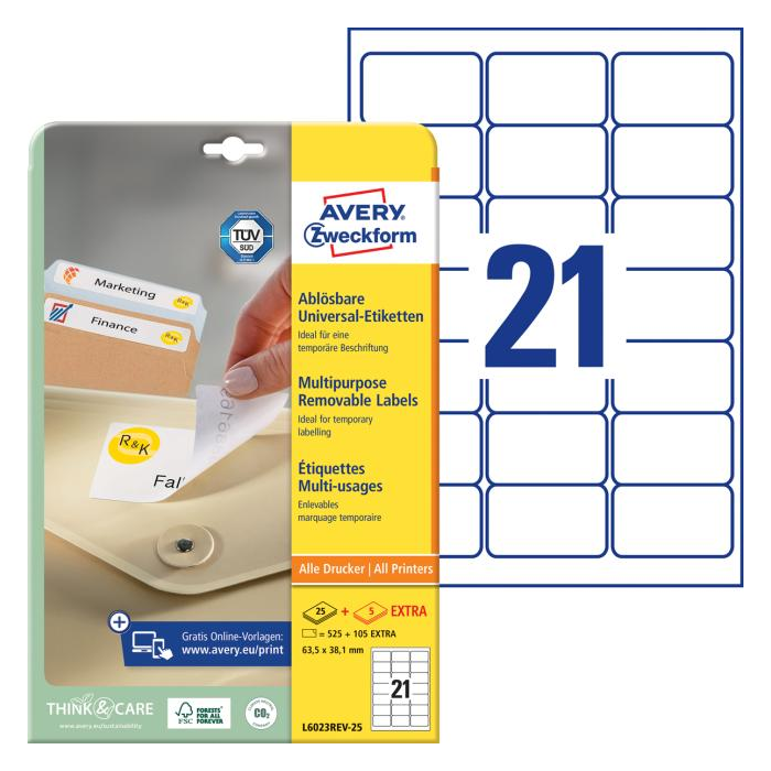 Odnímateľné samolepiace etikety odlepiteľné a znovu prelepiteľné (na bežnom povrchu až 5×) bez toho, aby zanechali stopy lepidla. Sú vhodné pre všetky druhy tlačiarní a kopíriek. Využiteľné najmä na každodenné pracovné činnosti, ako napr. vytváranie popisov, cenoviek, označovanie výrobkov, majetku a pod. Rozmery v mm : 63,5 × 38,1. Farba biela. Etikety na hárku 21 ks. Balenie 25+5 hárkov.