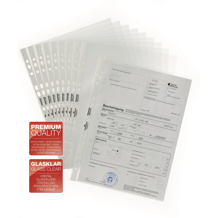 Priehľadný číry euroobal z polypropylénu. Otvor zhora, eurodierovanie, povrch lesklý a hladký. Formát A4. Balenie 100 ks v sáčku.