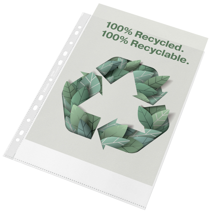 Ekologicky šetrný a opakovateľne recyklovateľný euroobal zo 100% recyklovaného PP. Formát A4, povrch matný, otvor zhora. Balené v 100% recyklovateľnej krabici z recyklovaného papiera. Reliéfny povrch z kvalitného materiálu v hrúbke 70 mikrónov. Vnútorný mikrofilm proti kopírovaniu bráni odtlačeniu textu z papiera na plast. Materiál bez obsahu kyselín chráni pred žltnutím papiera, takže je ideálny na dlhodobú archiváciu dôležitých dokumentov. Recyklovaný obsah externe auditovaný a certifikovaný UL. Vyrobené v Európe Balenie 100 ks.