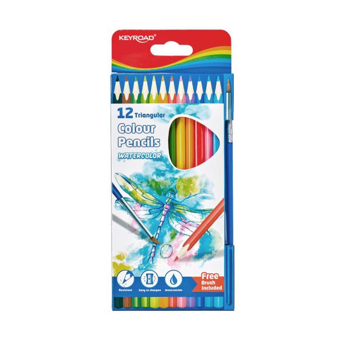 Akvarelové trojuholníkové ceruzky, na suché a mokré kreslenie, akvarel rozpustný vo vode. Odolné a ľahko sa brúsia. S mäkkým, bohato pigmentovaným grafitom, hrúbka: 3,0 mm. V sade 12 ks, plus 1 ks štetec. Farba: mix farieb.