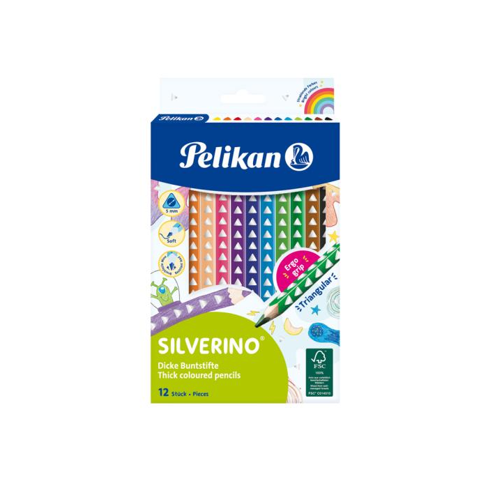 Farbičky Silverino trojhranné, hrubé so striebornými ryhami na všetkých troch stranách pre lepší úchop, priemer tuhy 4mm, s menovkou, 100% FSC drevo, balené v krabičke. Balenie 12 ks.