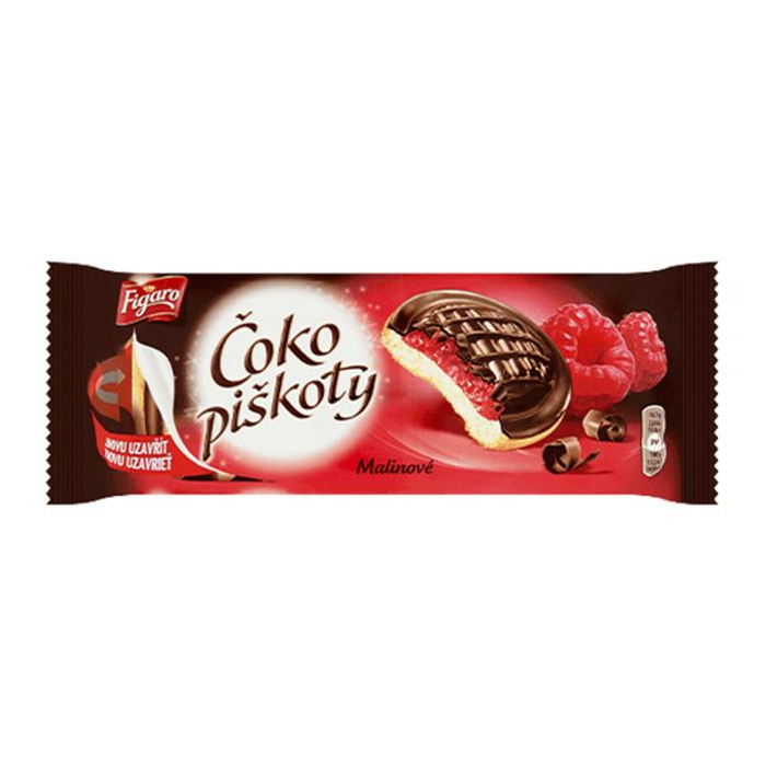 Plnené polomáčané piškóty so želé s chuťou maliny a horkej čokolády. Väčšie balenie 6 ks.