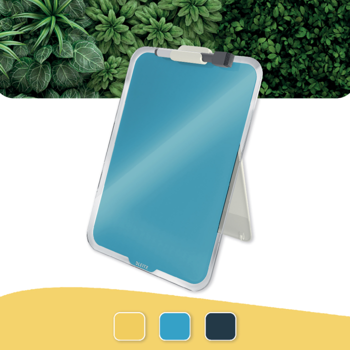 Značková kolekcia Leitz Cosy vám umožní cítiť sa ako doma, nech už vás váš pracovný deň zavedie kamkoľvek. Vďaka minimalistickému dizajnu a príjemným farbám môžete svojmu pracovnému priestoru pridať štýl a farbu. Stolný sklenený flipchart Leitz Cosy je unikátny nástroj na opakované písanie poznámok, suchým popisovačom jednoducho napíšete dôležité informácie, kedykoľvek ho utriete a môžete písať znova. Táto prémiová magnetická sklenená tabuľa je perfektným doplnkom vášho domova alebo kancelárie. Pamätá si za vás, pomôže vám pracovať efektívne celý deň. Rozmery 216 x 30 x 297. Farba modrá.