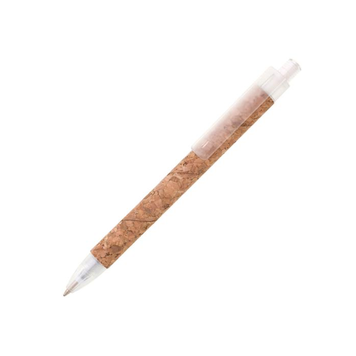 Guľôčkové pero KORK s povrchom z korku, zvyšok tela je z plastu. Modrá náplň X-20. Farba biela.