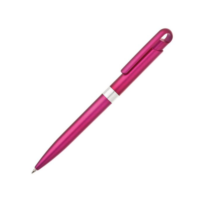 Plastové guľôčkové pero FIROL v metalických farbách. Uprostred pera je stieborný krúžok. Modrá náplň veľkoobjemová. Kolekcia DESIGN. Farba tmavo ružová.