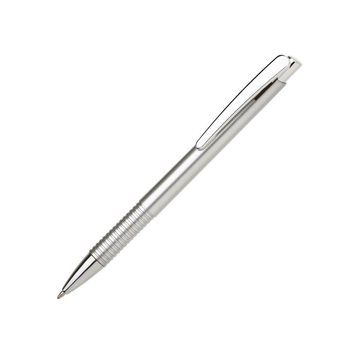 Guľôčkové pero plastové LASTI s vrúbkovaným úchopom a doplnkami v striebornej farbe. Modrá náplň X-20. Farba strieborná.