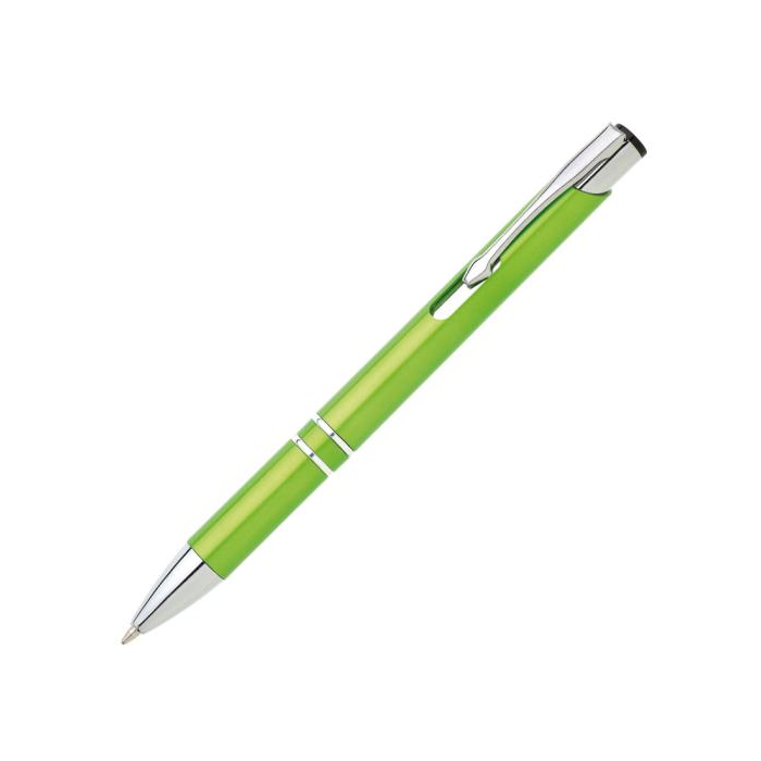 Plastové guľôčkové pero OIRA s kovovými doplnkami. Modrá náplň veľkoobjemová. Farba svetlozelená.