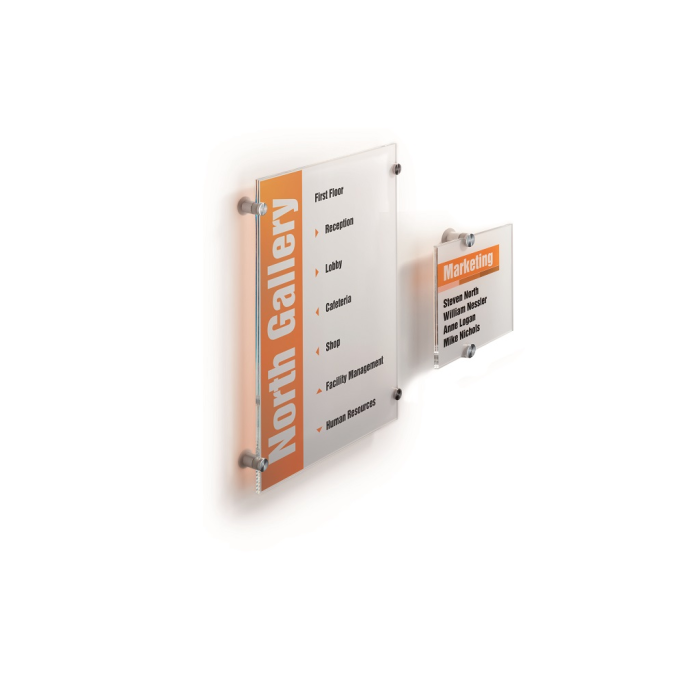 Tabuľka na dvere z novej rady v elegantnom, atraktívnom, a zároveň jednoduchom dizajne. Dodávaná s 2 polopriehľadnými vnútornými listami, vhodnými na farebnú alebo čiernu potlač. Listy sa vložia medzi akrylové panely tabuľky a tabuľka sa prichytí k stene alebo dverám 2 veľkými hliníkovými skrutkami. Ľahká montáž, názorný návod je priložený.