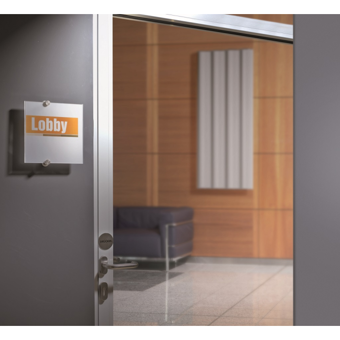 Tabuľka na dvere z novej rady v elegantnom, atraktívnom, a zároveň jednoduchom dizajne. Dodávaná s 2 polopriehľadnými vnútornými listami, vhodnými na farebnú alebo čiernu potlač. Listy sa vložia medzi akrylové panely tabuľky a tabuľka sa prichytí k stene alebo dverám 2 veľkými hliníkovými skrutkami. Ľahká montáž, názorný návod je priložený.