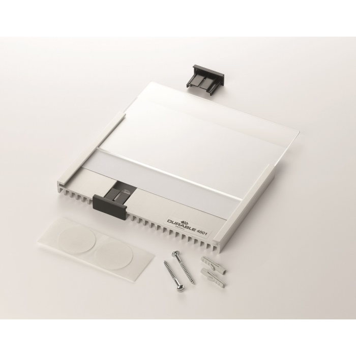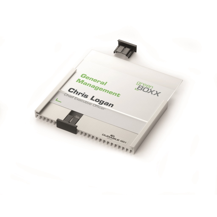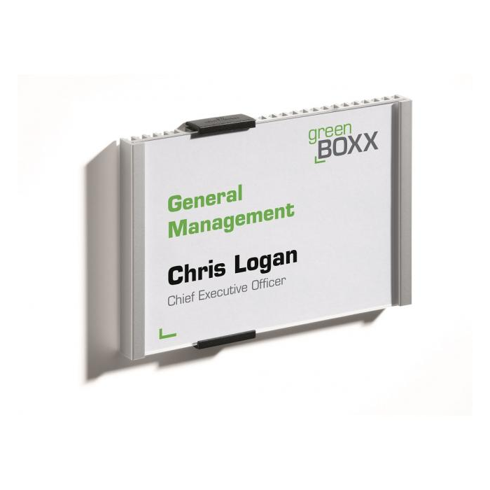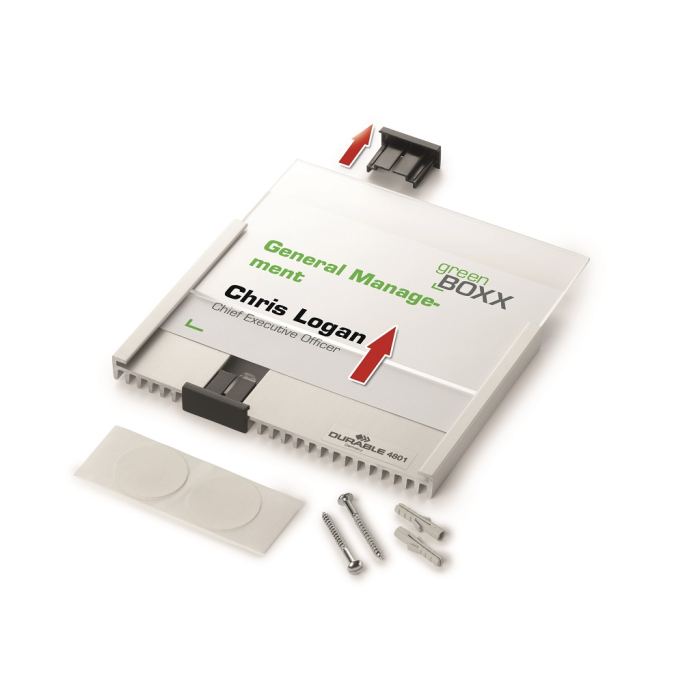 Informačná tabuľka na dvere. Štylizovaná tabuľka vo vrúbkovanej úprave, spodná časť z vysoko kvalitného hliníka, fixujúce spojky v čiernej farbe. K podkladu môže byť zadnou časťou priskrutkovaná alebo nalepená. Text je chránený neoslňujúcim akrylátovým krytom, ktorý pridržiavajú dve fixujúce spojky. Súčasťou balenia je montážna sada s názorným návodom a čistým listom papiera vo veľkosti tabuľky.