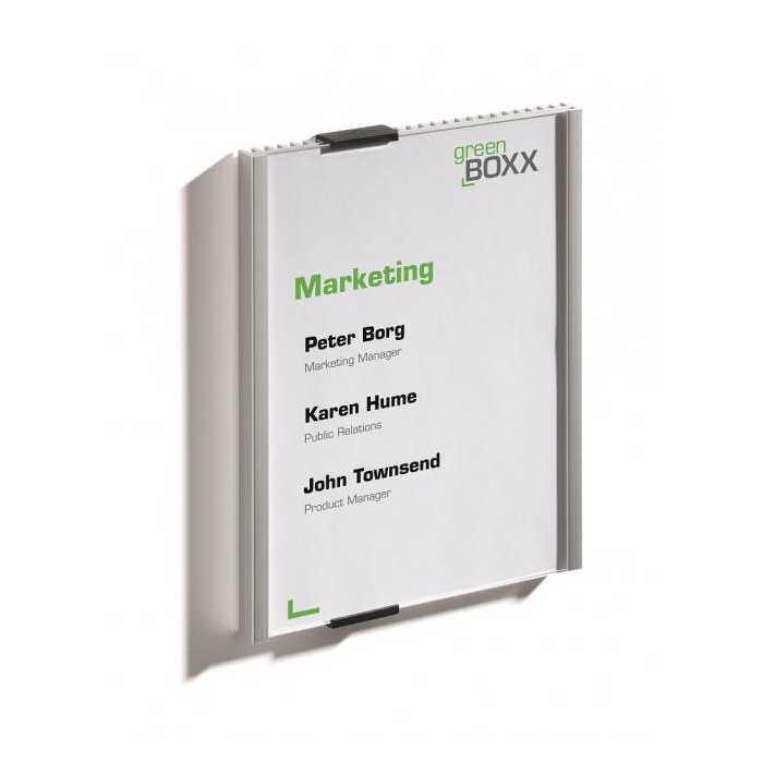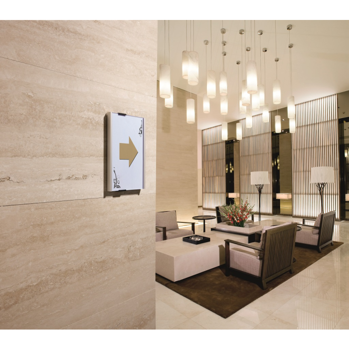 Informačná tabuľka na dvere. Štylizovaná tabuľka vo vrúbkovanej úprave, spodná časť z vysoko kvalitného hliníka, fixujúce spojky v čiernej farbe. K podkladu môže byť zadnou časťou priskrutkovaná alebo nalepená. Text je chránený neoslňujúcim akrylátovým krytom, ktorý pridržiavajú dve fixujúce spojky. Súčasťou balenia je montážna sada s názorným návodom a čistým listom papiera vo veľkosti tabuľky.