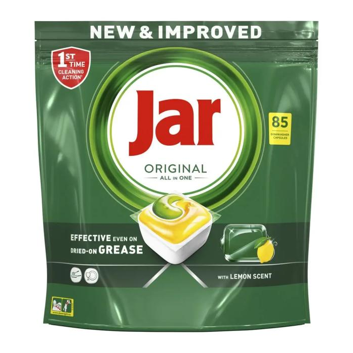 Kapsuly do umývačky riadu Jar Original All in One čistia hneď na prvýkrát, sú účinné aj pri zaschnutej mastnote a zanechajú váš riad žiarivo čistý. Jar kombinuje tekutinu a prášok do jednej silnej kapsuly. Jej vysokorozpustné vrecúško sa rýchlo rozpustí a čistí hneď od začiatku programu. A tak ľahko sa používajú! Nemusíte ich odbaľovať, stačí vložiť do dávkovača na čistiaci prostriedok do umývačky riadu.