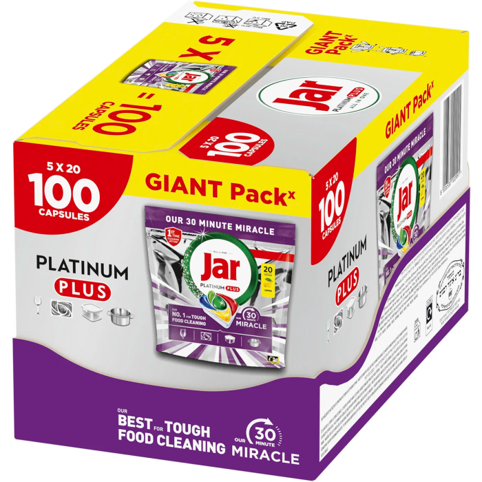 Zázračné riešenie všetko v jednom pre dokonale čistý riad bez námahy. Kapsule do umývačky riadu Jar 30 Minute Miracle Platinum Plus sú navrhnuté na rýchle a maximálne účinné umývanie aj silne znečisteného riadu. Vďaka pokročilej technológii a päťkomorovej kapsuli si poradia so zaschnutými zvyškami jedla už za 30 minút, bez nutnosti predumývania alebo opakovaného umývania. Ideálna voľba pre rušné domácnosti, ktoré chcú perfektný výsledok hneď po prvýkrát.