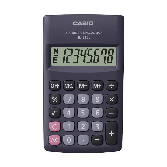 Malá vrecková kalkulačka s veľkým 8-miestnym LCD displejom a tlačidlami z tvrdej gumy. Technická špecifikácia: výpočet % a odmocniny, 3 tlačidlá na prácu s pamäťou, napájanie batériou LR6, rozmery 69,5 × 118 × 18 mm.