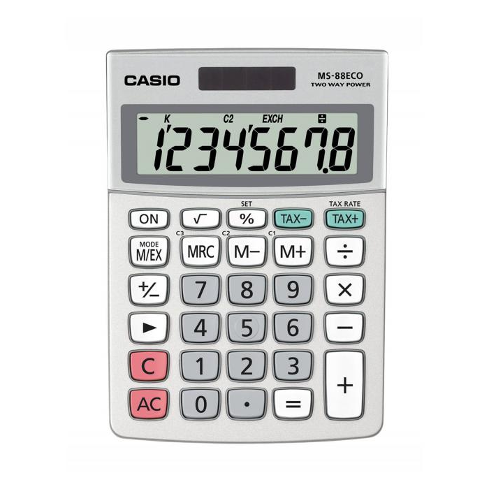 Stolová kalkulačka vyrobená z recyklovaného plastu s batériami bez obsahu ortute. Veľký 8-miestny displej a plastovými tlačidlami. Opravné tlačidlo a tlačidlá na výpočet daní a prepočet až 3 mien.