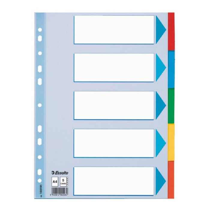 Celofarebný rozraďovač Esselte vyrobený z kartónu v rôznych farbách. Formát A4, eurodierovanie, popisovateľný titulný list na jasnú identifikáciu obsahu. Balenie jedna sada v polyesterovom sáčku. Väčšie balenie 20 sád.